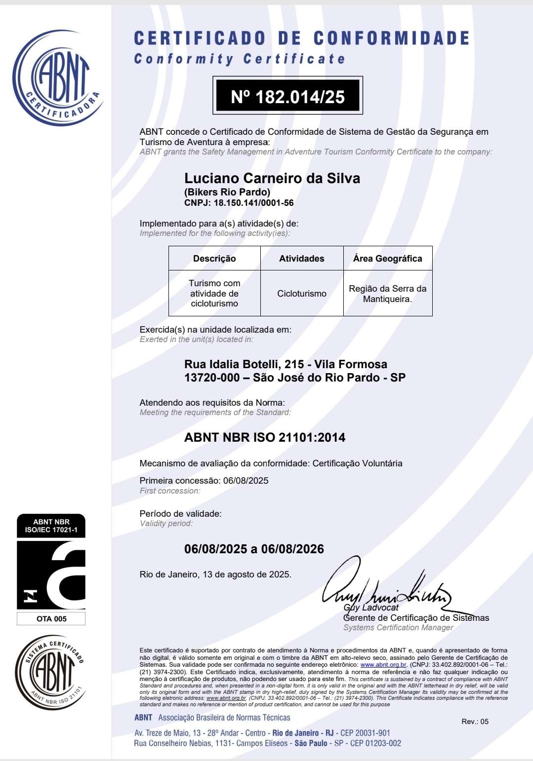 No Brasil, pouquíssimos empreendimentos têm a notoriedade em suas operações e serviços para dispor do selo ISO 21101, o que há de mais avançado quando o assunto é segurança no ecoturismo — especialmente no turismo de aventura.